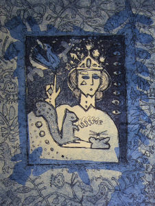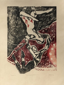 2016 - Linocut on Kitakata Washi Paper - 8 x 10 inches - Edition size: 30 - This edition of prints was inspired by political events and the divided social atmosphere in the United States in late 2016. The artist inked the background block with blue ink, red ink, or these two inks mixed together to produce various purple shades, as she created this series. The print-to-print variation in color in this numbered series is indicated by “E.V.”, which stands for “Edition Variable”.