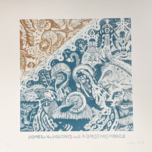 2018 - Wood Engraving on Cotton Paper - Image size: 7 x 7 inches - Paper size: 10 x 10 inches - Edition size: 8 - Based on a true story: the Thai eggplant in the manger represents our “miracle”, commemorating a family christmas gathering in Spokane WA when the artist’s brother-in-law remarked that they’d have better luck finding the baby Jesus than a Thai eggplant in the produce section of the local grocery store. The attending angel carries an Albertsons shopping bag. The wise men offer gifts of Thai basil and champagne.